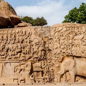 The Descent of the Ganges, also known as Bhagiratha's Penance, is a famous bas-relief sculpture located in Mahabalipuram. Carved into a rock face, it depicts the mythological story of King Bhagiratha, who performed intense penance to bring the sacred river Ganges to Earth.